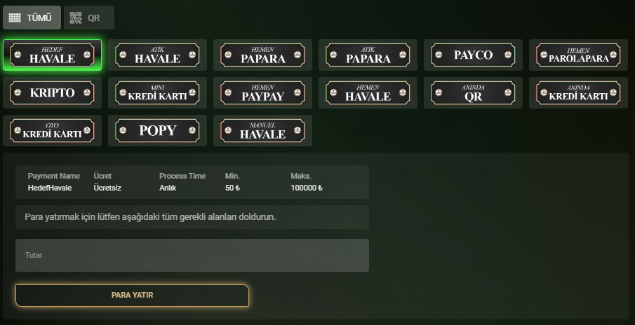 Banka havalesinden kripto paralara, Papara’dan Qr Kod’a kadar uzanan geniş seçenekler, her türlü tercihe ve stile hitap ederken, düşük minimum limitler yeni oyunculara kapılarını açıyor, yüksek maksimum çekim sınırları ise büyük kazançların sorunsuz bir şekilde hesabınıza ulaşmasını sağlıyor.